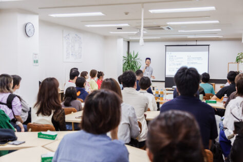 この日は、co-ba CHOFUを運営するPolarisの共同代表大槻や、会員さんも登壇しました。最近はおやつを囲むことが多い小上がりが、登壇者の想いを伝えるステージに様変わり。参加者たちは一人ひとりの話に聞き入りました。