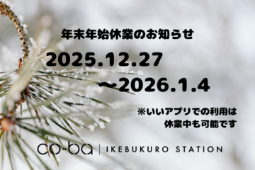 いつもご利用いただきありがとうございます。 以下の日程は、年末年始休業にてお休みとさせていただきます。 2025年12月27日(土)〜2026年1月4日(日) ※通常ドロップインはご利用いただけません。 ※いいオフィスアプリでご利用の方は通常通りご利用いただけます。 ※月額会員の方は通常通りご利用いただけます。 ご迷惑をおかけしますが、ご了承いただきますようよろしくお願い申し上げます。