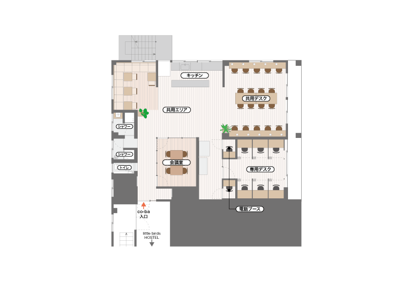 昭和のビルをリノベーションしたコワーキングスペースco-baと、ゲストハウス「Little Birds Hostel」を併設。